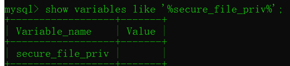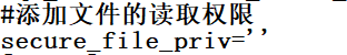 然后再查询看看是否真的打开了 命令 show variables like '%secure_file_priv%',如下图,是打开了的