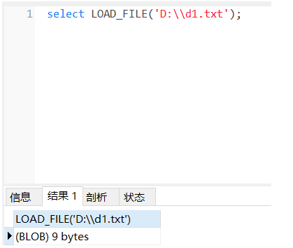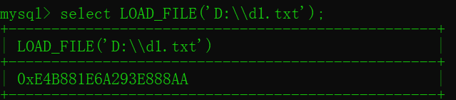 现在读取一个文件试试,路径是D:\\d1.txt 命令为 select LOAD_FILE('D:\\d1.txt')