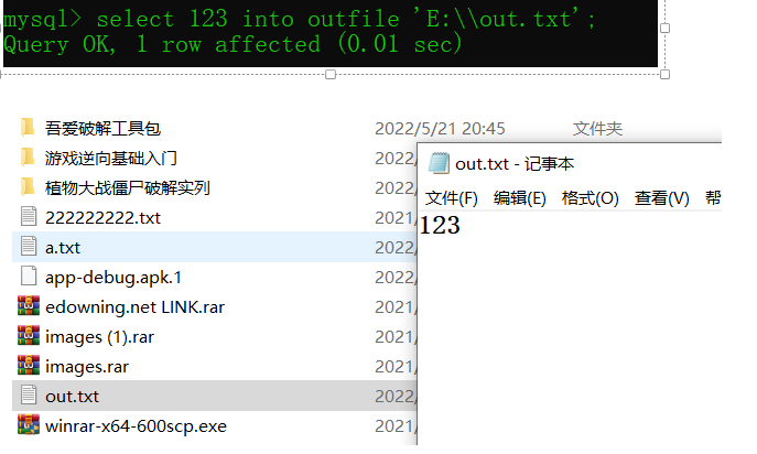 然后还可以写入一个文件到本地文件,命令 select 123 into outfile 'E:\\out.txt'