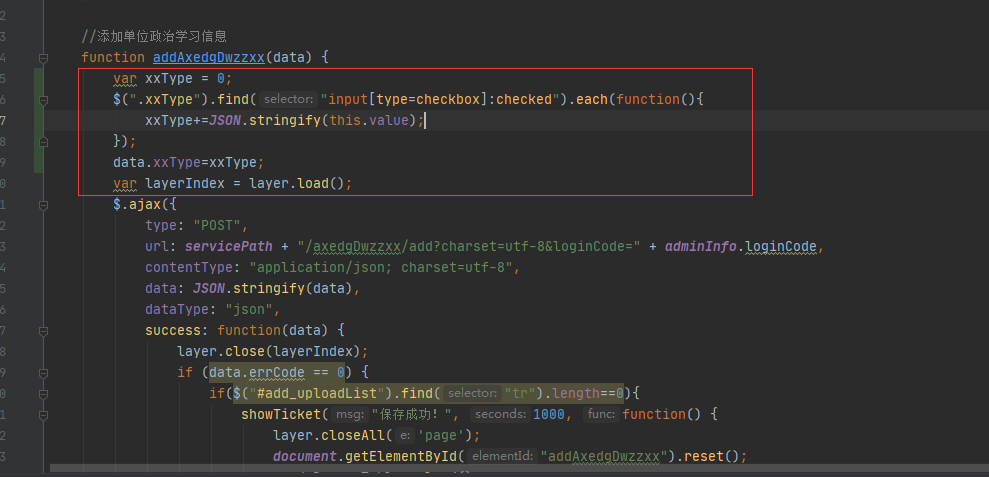 var xxType = 0; $(".xxType").find("input[type=checkbox]:checked").each(function(){ xxType+=JSON.stringify(this.value); }); data.xxType=xxType; var layerIndex = layer.load();