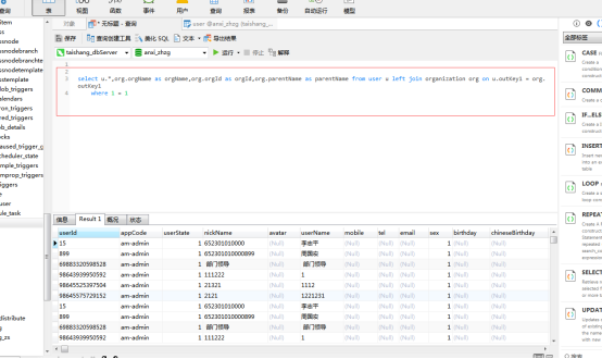 select u.*,org.orgName as orgName,org.orgId as orgId,org.parentName as parentName from user u left join organization org on u.outKey1 = org.outKey1