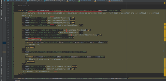 <if test="orgId != null and orgId !=''"> and u.orgId=#{orgId}</if>