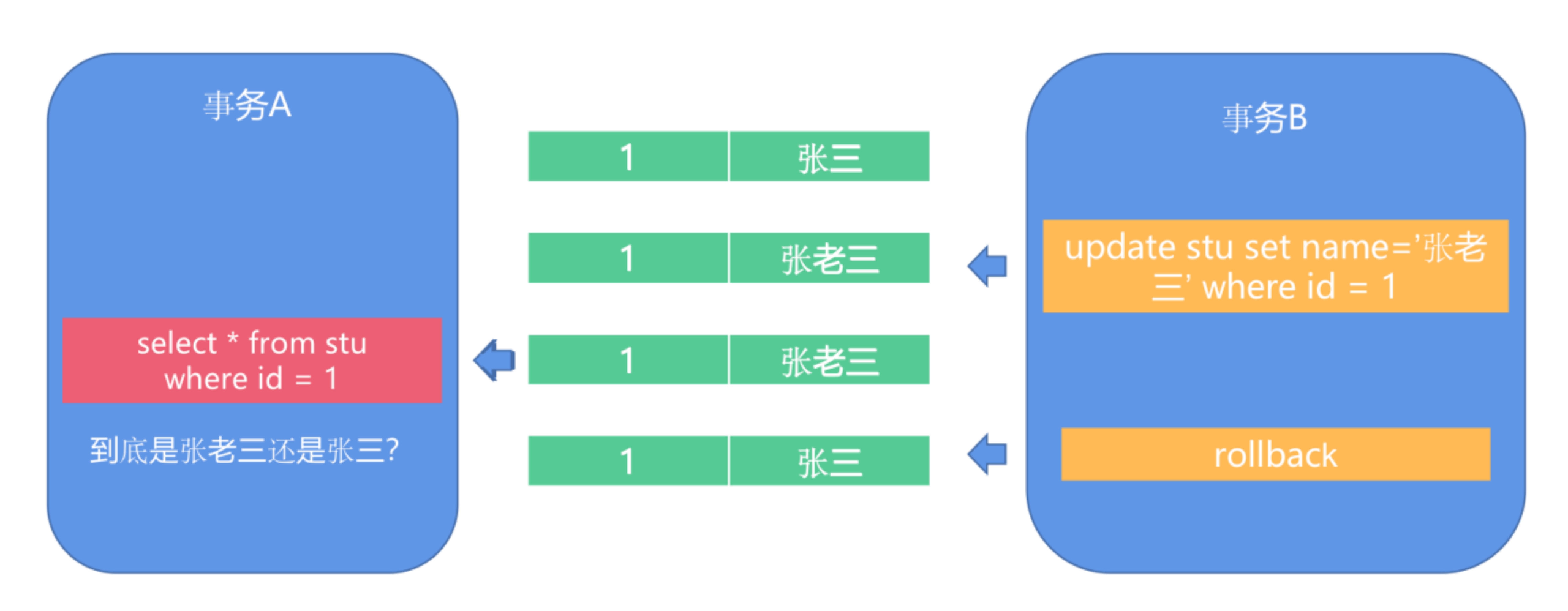 上述案例:事务B将“张三”更新为“张老三”,此时事务还未提交。与此同时,事务A读取了该条记录,事务A读到的值是“张老三”,事务B进行回滚。这时数据库里存储的这条数据name依然是“张三”,但是事务B读到的却是“张老三”,这个案例就是典型的脏读。