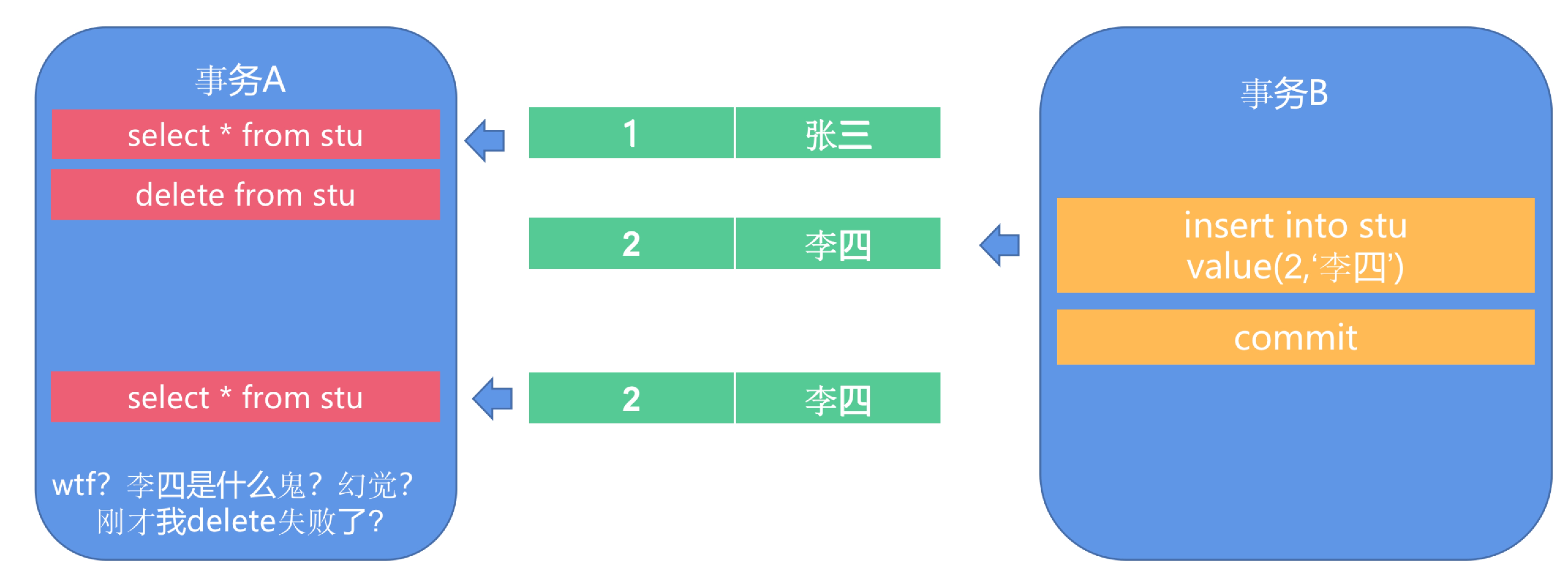 上述案例:事务A查询stu表,并删除了该表的数据。事务B紧接其后新增了数据并且对数据进行了提交。事务A再次查询stu表数据,发现删除的数据又回来了,产生疑惑?是不是刚才执行失败了?