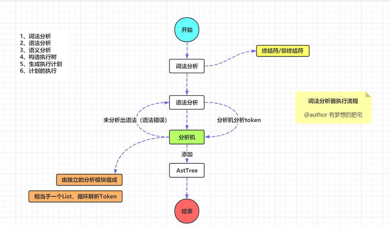 MySQL 从你输入的"select"这个关键字识别出来,这是一个查询语句。它也要把字符串“T”识别成“表名 T”,把字符 串“ID”识别成“列 ID”。 做完了这些识别以后,就要做“语法分析”。根据词法分析的结果,语法分析器会根据语法规则,判断你输入的这个 SQL 语句 是否满足 MySQL 语法。