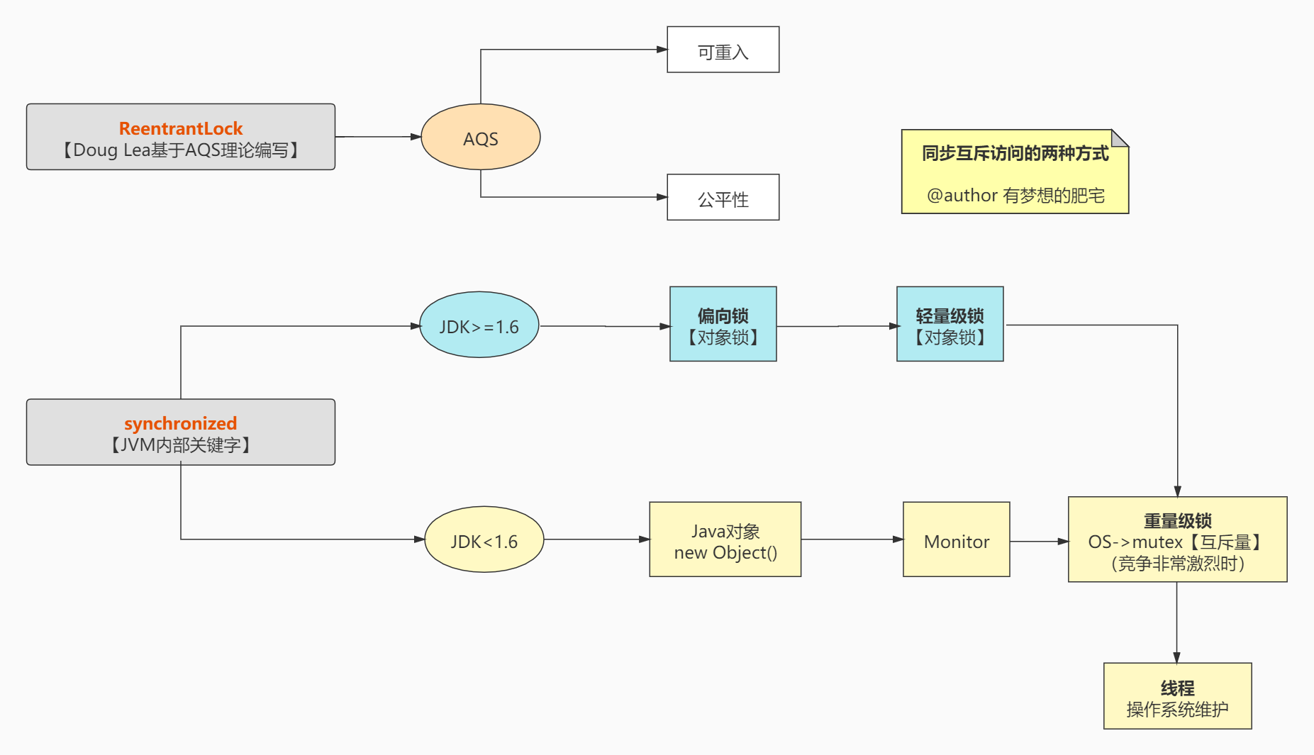 synchronized是基于JVM内置锁实现,通过内部对象Monitor【监视器锁】实现,基于进入与退出Monitor对象实现方法与代码块同步,监视器锁的实现依赖底层操作系统的Mutex lock【互斥锁】实现,它是一个重量级锁性能较低。经优化后内置锁的并发性能已经基本与Lock持平。 synchronized关键字被编译成字节码后会被翻译成 monitorenter 和 monitorexit 两条指令分别在同步块逻辑代码的起始位置与结束位置。