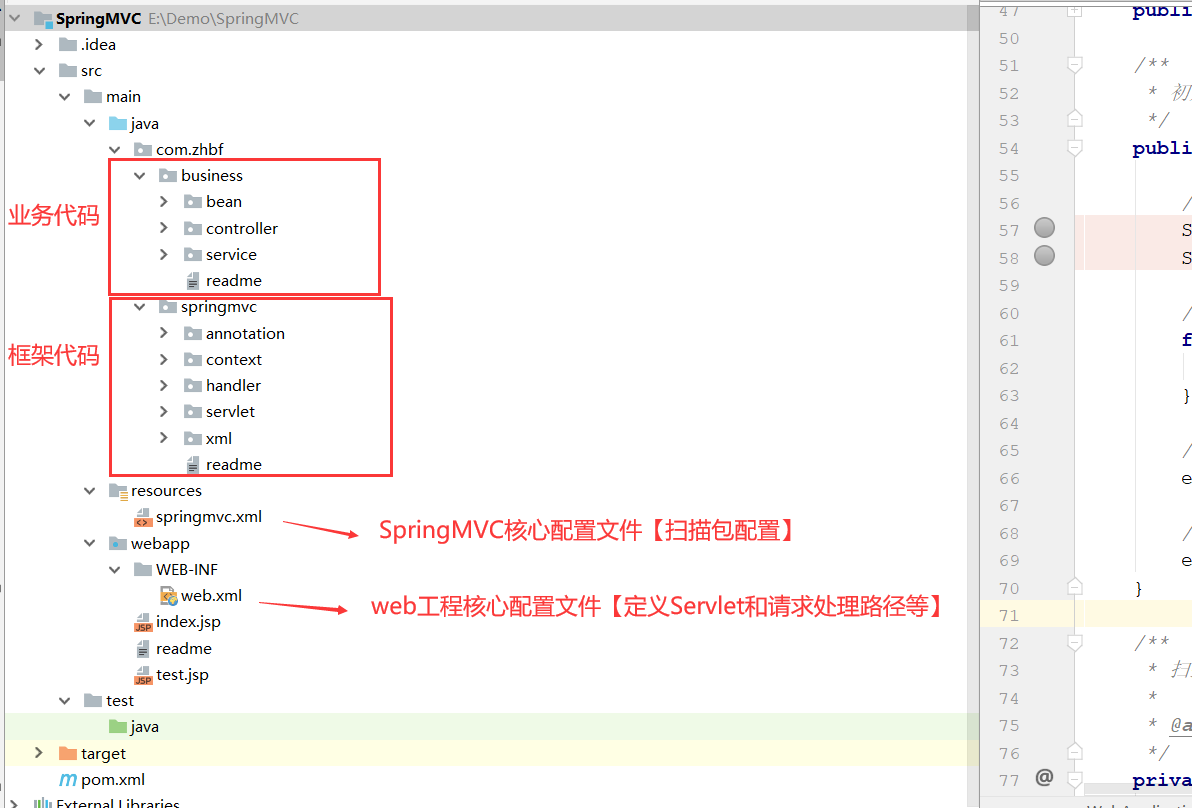 这里解释一下为什么我要花好几天的时间手写一个SpringMVC的框架并且做一个总结呢?首先我是希望通过这种方式来了解SpringMVC的启动流程大概做了哪些工作,其次这是一个简易版的实现,还会有一些BUG和功能上的不足。我只实现了主线流程,因为看源码主要还是需要掌握其核心流程做了什么,所以我也希望通过这种方式来进行源码阅读后的记录和总结。工程我已经搭建好并测试过了,注释也写得比较详细,感兴趣的小伙伴可以关注私聊我给你们发工程地址~