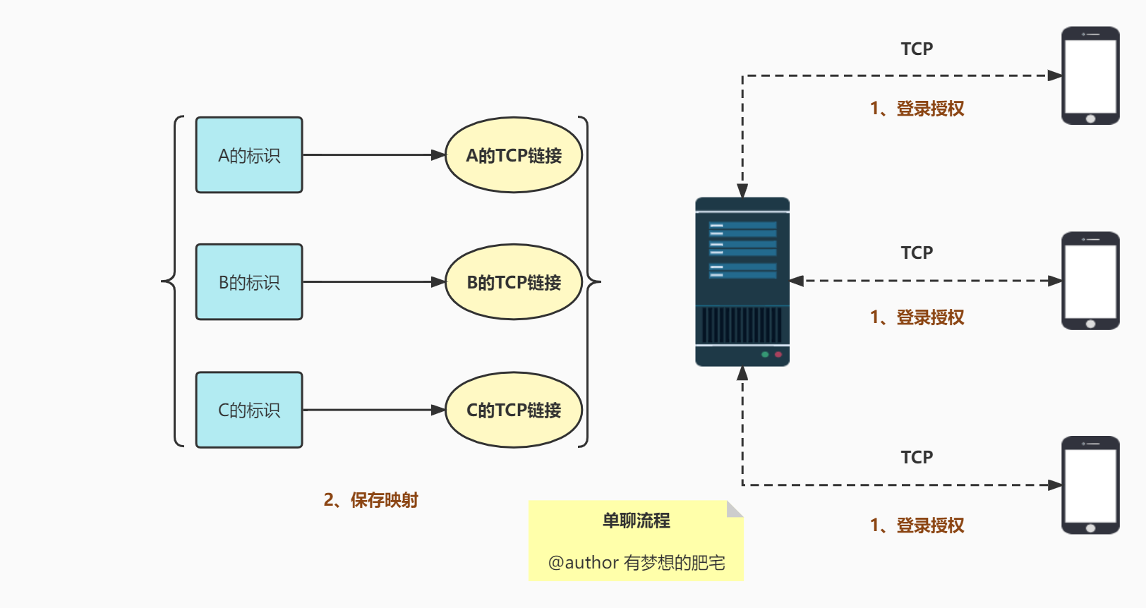- 1、A、B、C依然会经历登录流程,服务端保存用户标识对应的TCP连接。