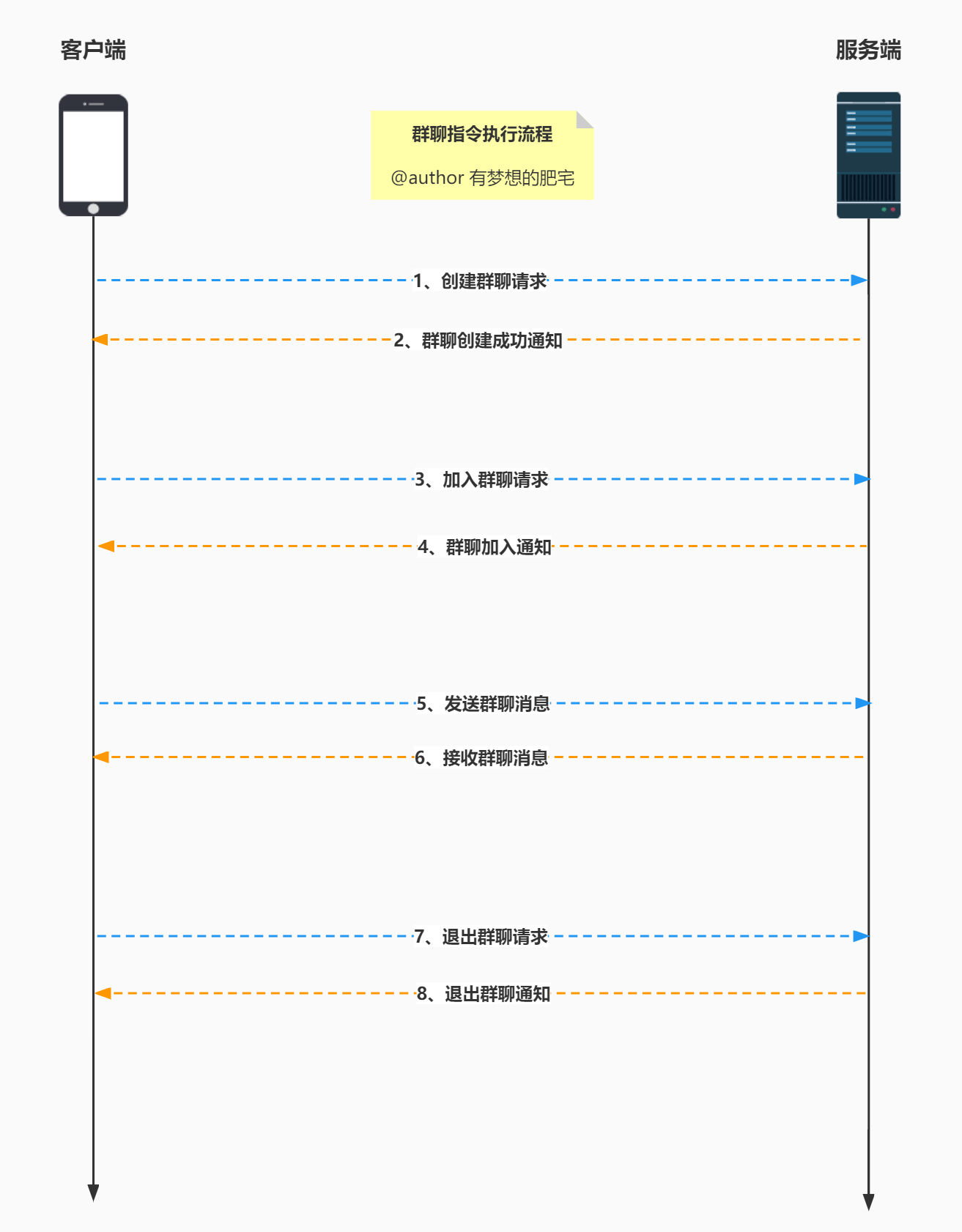 - 3、群聊中任意一方在群里聊天的时候,将群ID发送至服务端,服务端获取到群ID后,取出对应的用户标识,遍历用户标识对应的TCP连接,就可以将消息发送至每一个群聊成员。