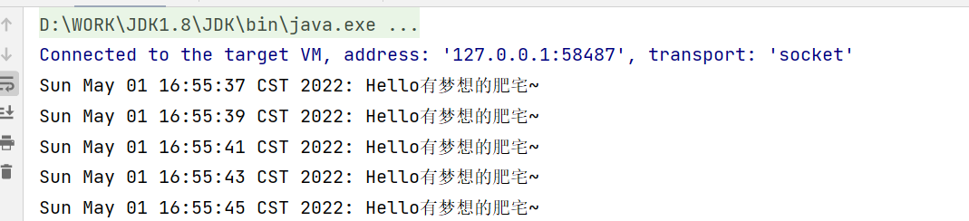 /** * BIO客户端 * * @author 有梦想的肥宅 * @date 2022/5/1 */ public class BIOClient { public static void main(String[] args) { new Thread(() -> { try { //1、连接127.0.0.1:8000端口 Socket socket = new Socket("127.0.0.1", 8000); while (true) { try { //2、每间隔2秒向服务端发一个请求,输出一句话 socket.getOutputStream().write((new Date() + ": Hello有梦想的肥宅~").getBytes(StandardCharsets.UTF_8)); Thread.sleep(2000); } catch (Exception e) { e.printStackTrace(); } } } catch (Exception e) { e.printStackTrace(); } }).start(); } }