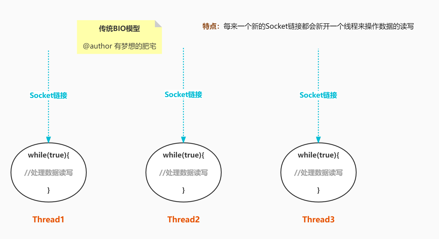 /** * BIO服务端 * * @author 有梦想的肥宅 * @date 2022/5/1 */ public class BIOServer { public static void main(String[] args) throws Exception { //1、创建一个服务端的套接字,监听8000端口 ServerSocket serverSocket = new ServerSocket(8000); //2、创建线程去接收新的连接 new Thread(() -> { while (true) { try { //2.1 阻塞方法获取新连接 Socket socket = serverSocket.accept(); //3、为每一个新连接都创建线程,负责读取数据 new Thread(() -> { try { int len; byte[] data = new byte[1024]; InputStream inputStream = socket.getInputStream(); //3.1 按字节流方式读取数据 while ((len = inputStream.read(data)) != -1) { System.out.println(new String(data, 0, len)); } } catch (Exception e) { e.printStackTrace(); } }).start(); } catch (IOException e) { e.printStackTrace(); } } }).start(); } }