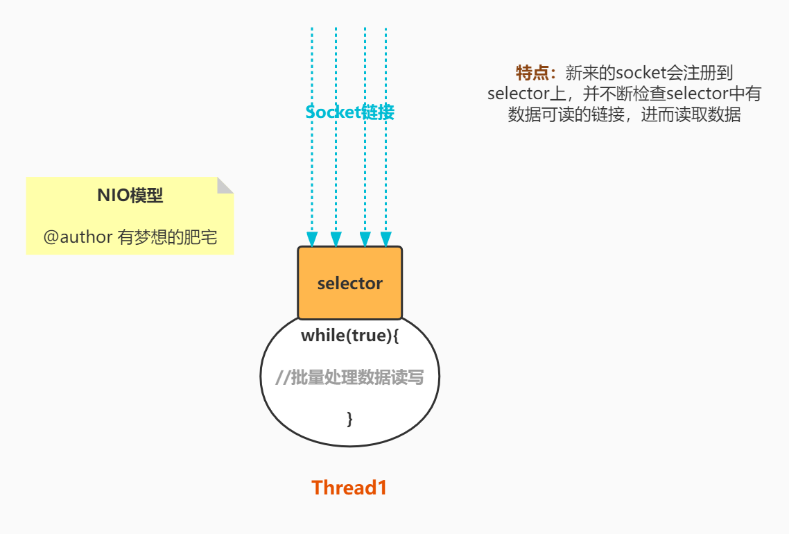 - 3、读数据的selector被死循环包着,若某一时刻有多个链接有数据可读,则批量取出来进行处理。