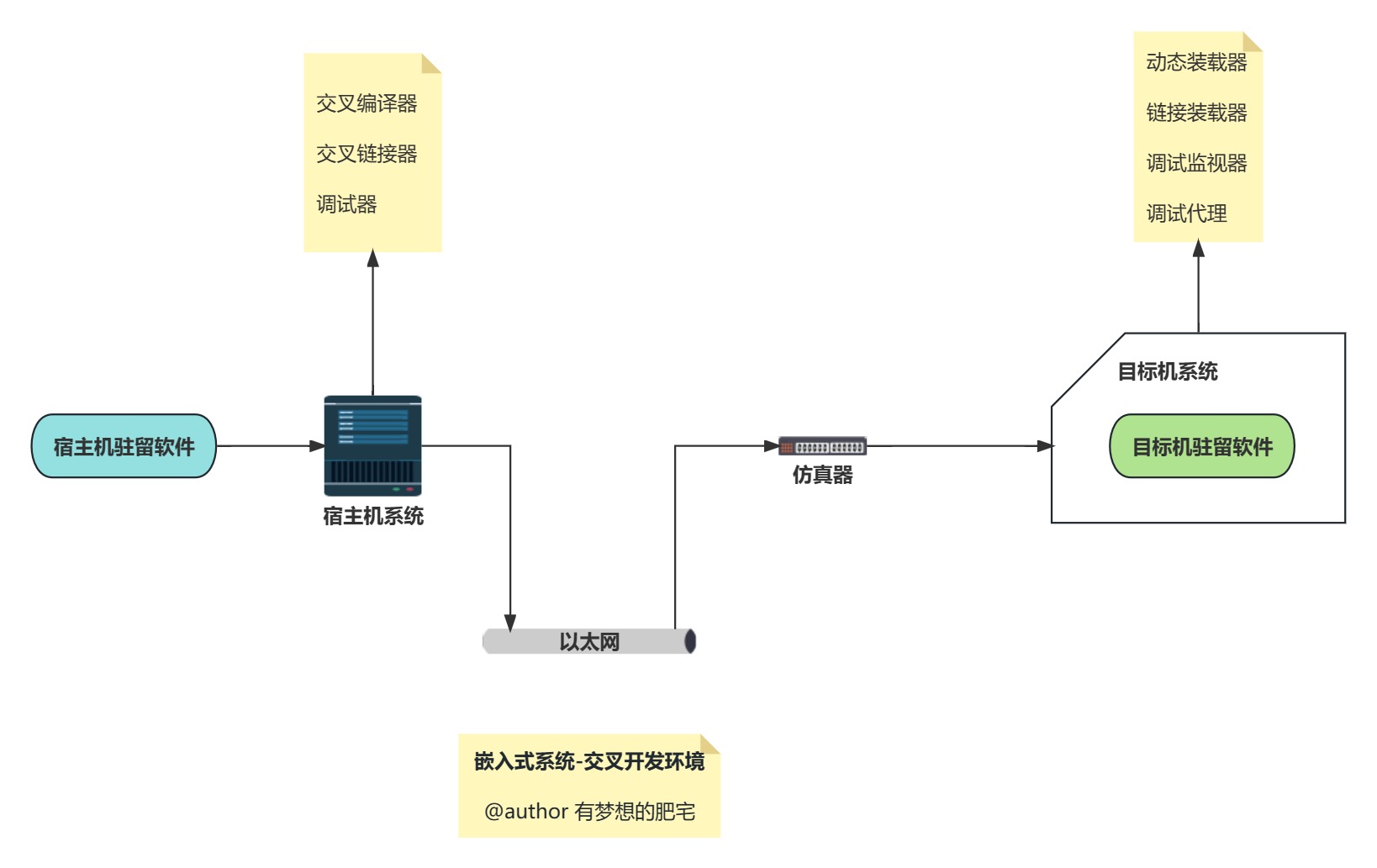 - 在宿主机 (PC 机或工作站) 上使用专门的嵌入式工具开发,生成二进制代码后,需要使用工具装载到目标机或固化在目标机储存器上运行。