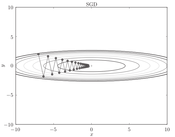 这种形状的函数应用SGD。从(z, y))=(一7.0,2.0)处(初始值)开始搜索。基于SGD的最优化的更新路径:呈“之”字形朝最小值(0,0)移动,效率低。