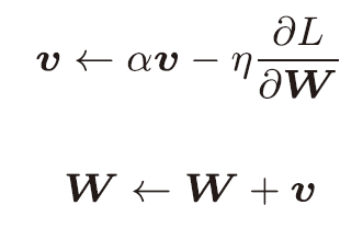 和前面的SGD一样,W表示要更新的权重参数, 表示损失函数关于W的梯度,η 表示学习率。这里新出现了一个变量v,对应物理上的速度。