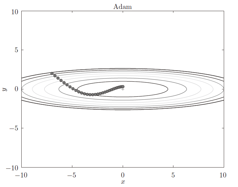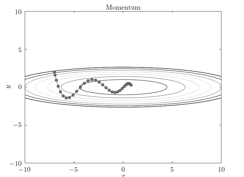 更新路径就像小球在碗中滚动一样。和SGD相比,我们发现“之”字形的“程度”减轻了。这是因为虽然α轴方向上受到的力非常小,但是一直在同一方向上受力,所以朝同一个方向会有一定的加速。反过来,虽然y轴方向上受到的力很大,但是因为交互地受到正方向和反方向的力,它们会互相抵消,所以y轴方向上的速度不稳定。因此,和SGD时的情形相比,可以更快地朝z轴方向靠近,减弱“之”字形的变动程度。