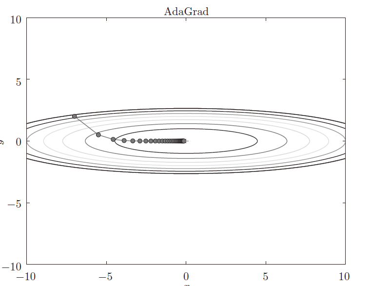 逐渐减小学习率的想法,相当于将“全体”参数的学习率值一起降低。而AdaGrad进一步发展了这个想法,针对“一个一个”的参数,赋予其“定制”的值。
