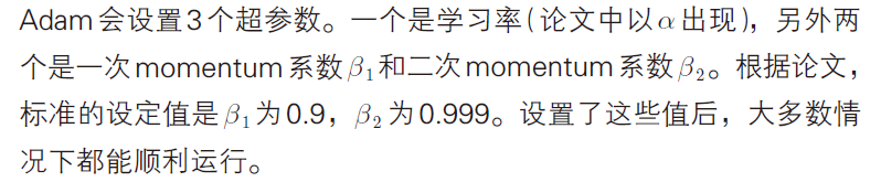 Adam是2015年提出的新方法。它的理论有些复杂,直观地讲,就是融合了Momentum和 AdaGrad的方法。通过组合前面两个方法的优点,有望实现参数空间的高效搜索。此外,进行超参数的“偏置校正”也是Adam的特征。