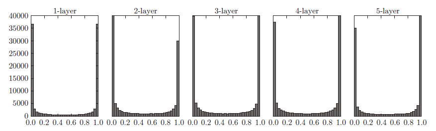 使用标准差为1 的高斯分布作为权重初始值时的各层激活值的分布