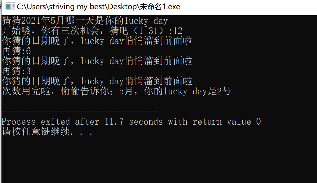 #include<stdio.h> #include<stdlib.h> #include<time.h> int main() { int x,n,a; srand(time(0)); x =1+ rand() % 31; printf("猜猜2021年5月哪一天是你的lucky day\n开始喽,你有三次机会,猜吧(1^31):"); for(n=1;n<=3;n++) { scanf("%d",&a); if(a==x){ printf("恭喜你呀,猜对啦!\n"); break; } else if(a<x){ if(n<=2) printf("你猜的日期早了,lucky day还没到呢\n再猜:"); else printf("你猜的日期早了,lucky day还没到呢\n"); } else{ if(n<=2) printf("你猜的日期晚了,lucky day悄悄溜到前面啦\n再猜:"); else printf("你猜的日期晚了,lucky day悄悄溜到前面啦\n"); } } while(n>3){ printf("次数用完啦,偷偷告诉你:5月,你的lucky day是%d号\n",x) ; break; } return 0; }