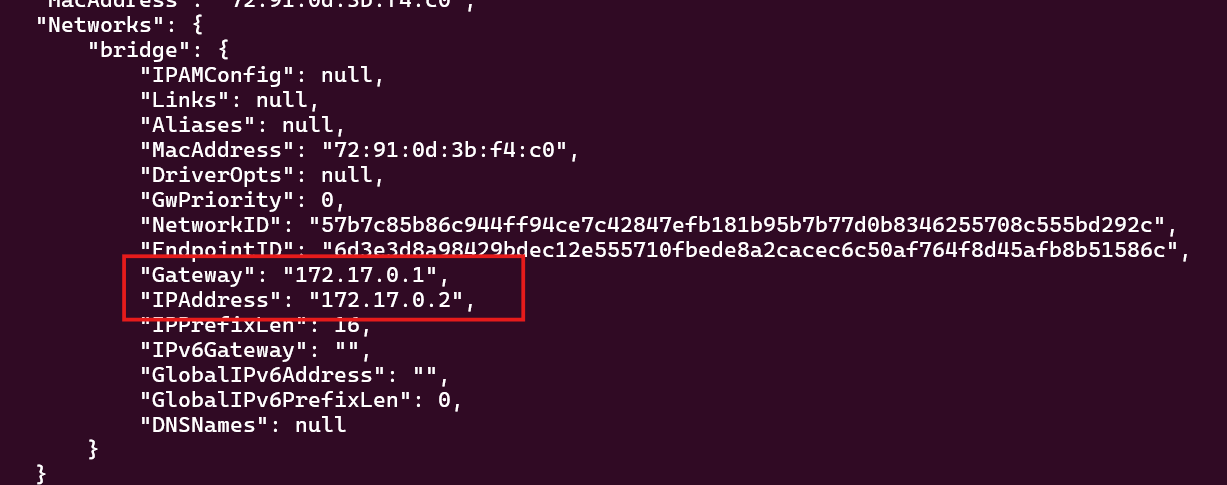 docker container inspect <container_name>可查看容器,可看到容器1的ip为172.17.0.2,容器2为172.17.0.3,容器之间可以通过这个容器ip+容器port直接访问,如curl http://172.17.0.3:80,注意这里的80是容器的端口不是主机端口