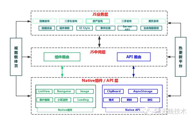 首先从整体上了解一下基于RN的APP开发架构。架构共分为五个部分:Native组件/API层、JS中间层、JS业务层、视图载体页、热更新平台。JS业务层、JS中间层、Native组件/API层三者运行于视图载体页中,且JS业务层和JS中间层的代码更新是通过热更新平台更新到用户手机应用中的。Native组件/API层是整个装置的基石,JS业务层通过JS中间层调用Native组件与API。