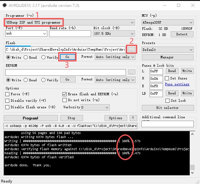 - 烧录hex文件: AVRDUDESS -> Flash 导入 xxx.with_bootloader.xxx.hex 点击Go