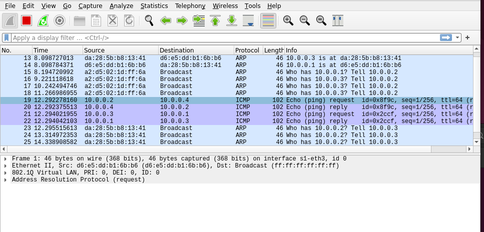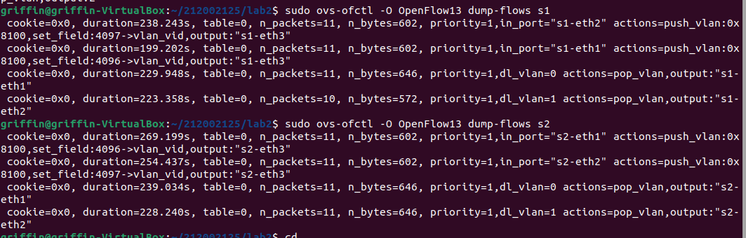 s2.cmd('sudo ovs-ofctl -O OpenFlow13 add-flow s2 priority=1,in_port=2,actions=push_vlan:0x8100,set_field:4097-\>vlan_vid,output:3')