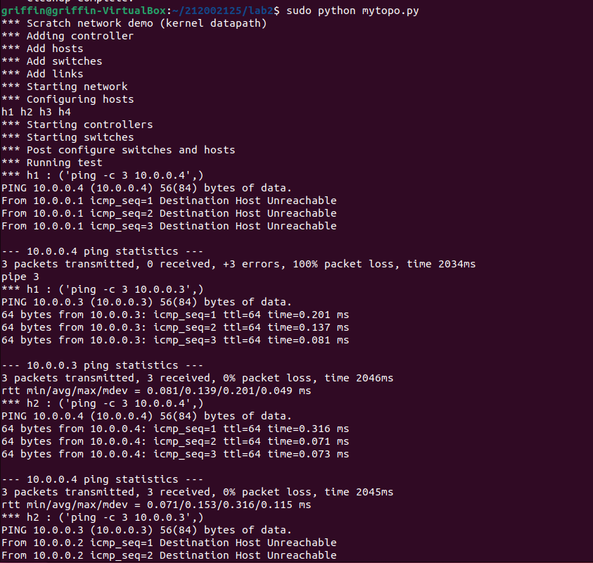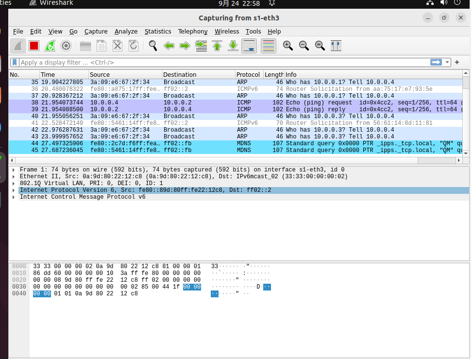 本次实验有用到上一次构建拓扑的的方法,主要先构建一个拓扑结构,然后使用了新的ovs交换机,将原本全通的链路进行阻断,这其中在一开始顺序搞错了,创建好全通的拓扑以后没有添加流表就继续pingall了以为出错,又重新检查代码,在添加好流表以后,成功阻断,实现了实验要求的h1和h3,h2和h4的连通。然后下载没用过的抓包软件还是比较顺利,要注意的是,将wireshark软件打开后,需要重回mininet,pingall一下,这时wireshark将会对选择的s1进行抓包。在进阶实验中,根据参考实验写好代码以后需要将之前构建的拓扑结构删除,不然端口会一直被占用,使用sudo mn -c进行删除