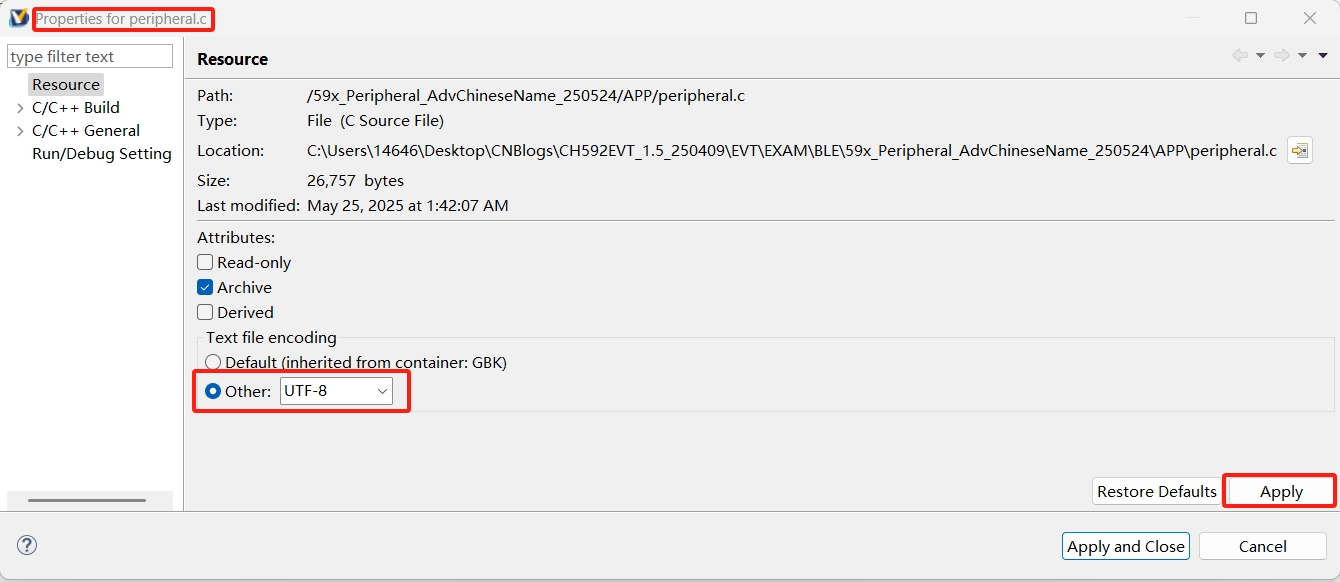MRS编译器对应文件需改为UTF-8编码,默认为GBK编码,修改方式右击文件如peripheral.c选择最下方的属性便可配置编码方式: