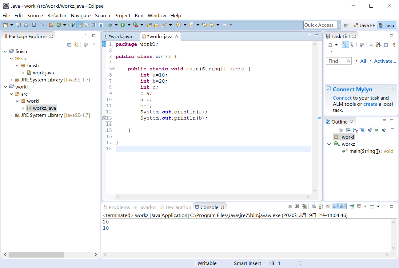 package workl; public class workz { public static void main(String[] args) { int a=10; int b=20; int c; c=a; a=b; b=c; System.out.println(a); System.out.println(b); } }