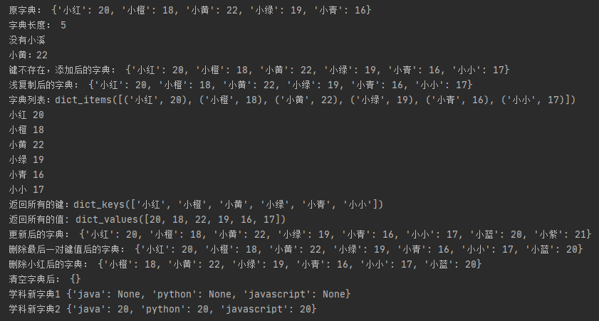 dict_age = {"小红": 20, "小橙": 18, "小黄": 22, "小绿": 19, "小青": 16}