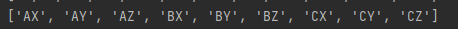 # 双重循环 temp_demo3 = [m + n for m in 'ABC' for n in 'XYZ'] print(temp_demo3)