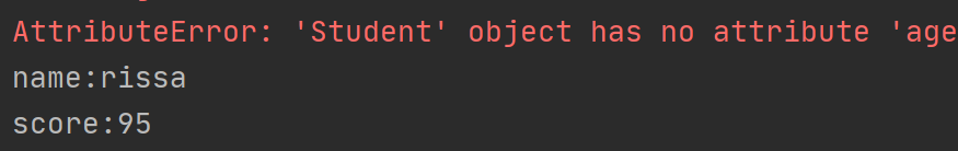 class Student(object): def __init__(self): self __slots__ = ("name", "score") # 以元组的方式 # 创建一个实例 s = Student() # 动态给实例绑定属性 s.name = "rissa" print("name:%s" % s.name) s.score = "95" print("score:%s" % s.score) s.age = 18 print("age:%s" % s.age)
