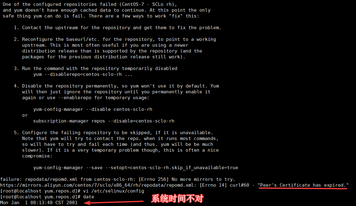 https://mirrors.aliyun.com/centos/7/sclo/x86_64/rh/repodata/repomd.xml: [Errno 14] curl#60 - "Peer's Certificate has expired."