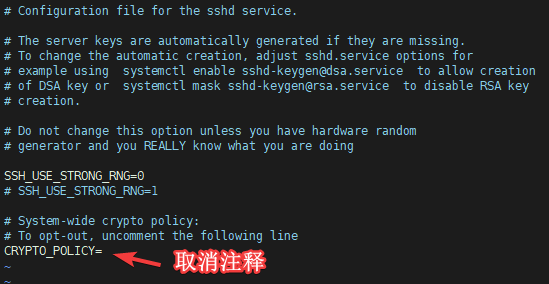 /etc/sysconfig/sshd 取消注释最后一行“CRYPTO_POLICY=”