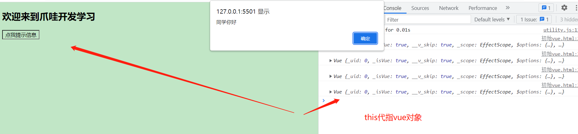 4)methods中配置的函数,都是被Vue所管理的函数,this的指向是vm或组件实例对象