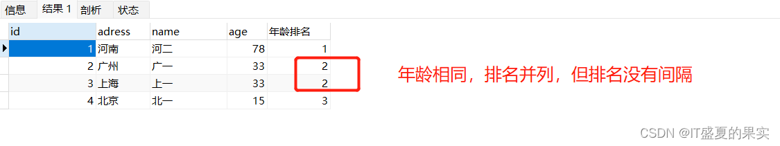描述:按照顺序进行排名,如果年龄相同,排名并列,中间没有有间隔。