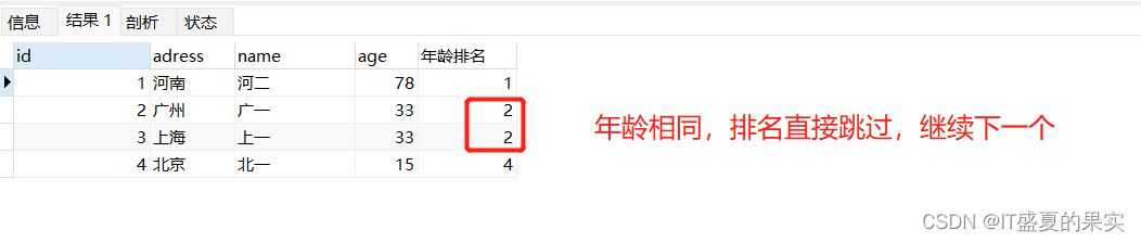 描述:按照顺序进行排名,如果年龄相同,排名并列,中间有间隔。