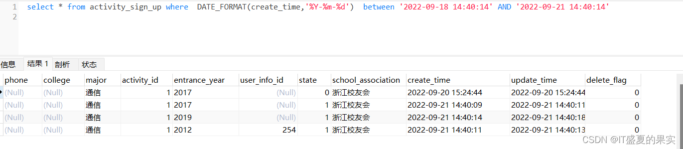 select * from activity_sign_up where  DATE_FORMAT(create_time,'%Y-%m-%d')  between '2022-09-18 14:40:14' AND '2022-09-21 14:40:14'