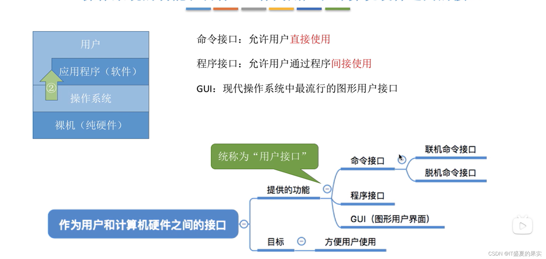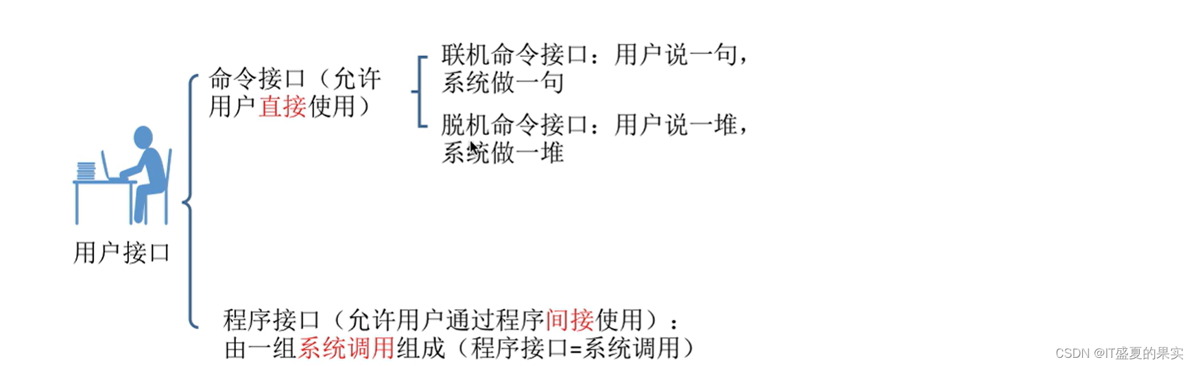 操作系统作为用户与计算机之间的接口,提供了命令接口、程序接口、GUI三个功能。其中命令接口和程序接口也称之为“用户接口”。