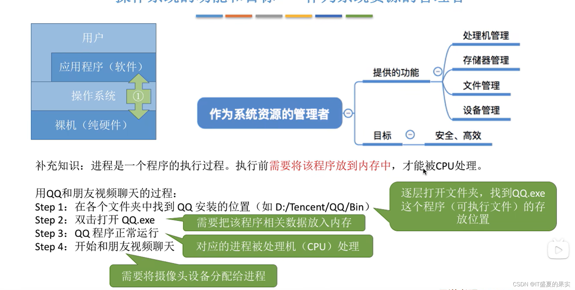 上述以QQ视频聊天的例子为我们讲解了操作系统作为系统资源的管理者所需要提供的功能