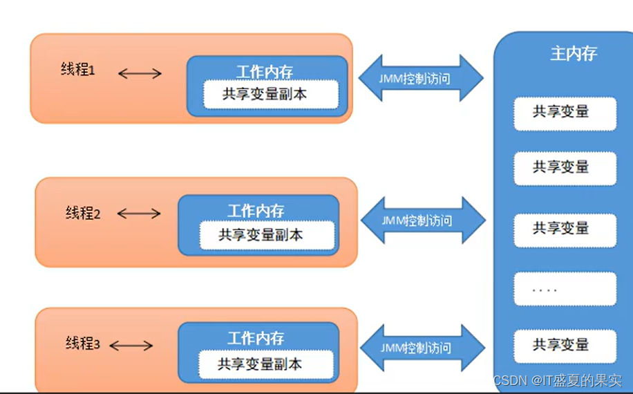 - 每一个线程还存在自己的工作内存,线程的工作内存,保留了被线程使用的变量的工作副本