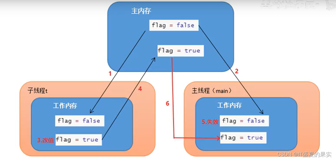 4)当子线程将flag的值写回去后,失效其他线程对此变量副本(volatile的作用)