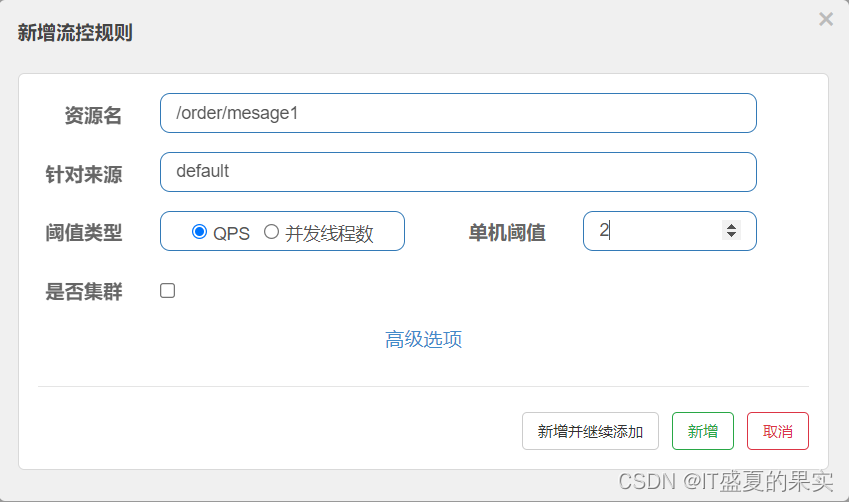 sentinel会记录我们服务的请求,我们可以简单的对一个接口进行流控测试。如上图所示点击“流控”后。