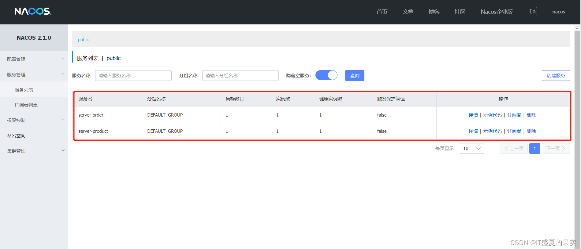 都配置成功后,启动shop-order微服务和shop-product微服务。发现这两个服务都已经注册到nacos中。