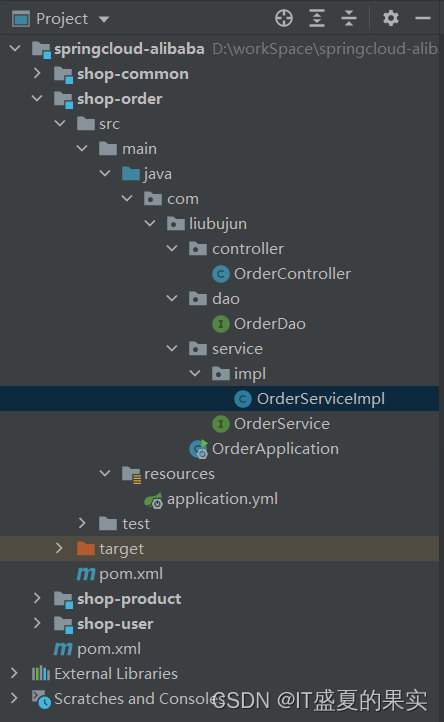 此篇项目代码分为5个模块:springcloud-alibaba父工程、共用模块shop-common、订单微服务shop-order、商品微服务shop-product、用户微服务服务shop-user。