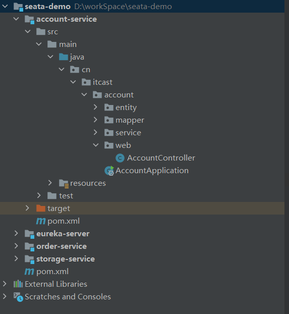 demo介绍:springcloud搭建,eureka为注册中心,包含了三个微服务(库存服务,订单服务,账户服务)