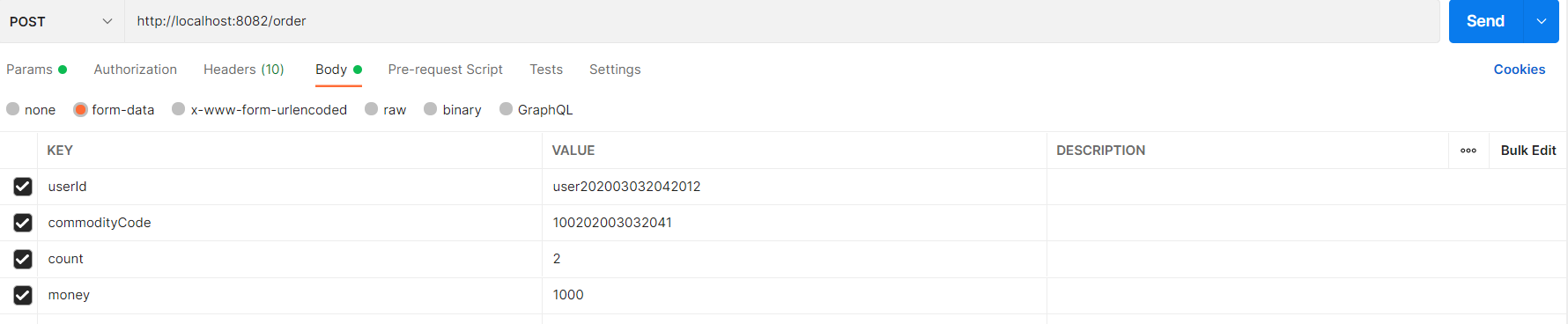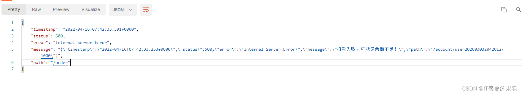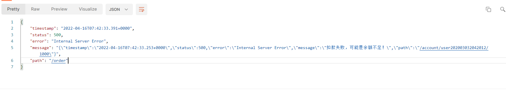 发送请求:(扣减账户为1000)此时肯定会报错,表中数据没有变化则说明分布式事务已经起作用