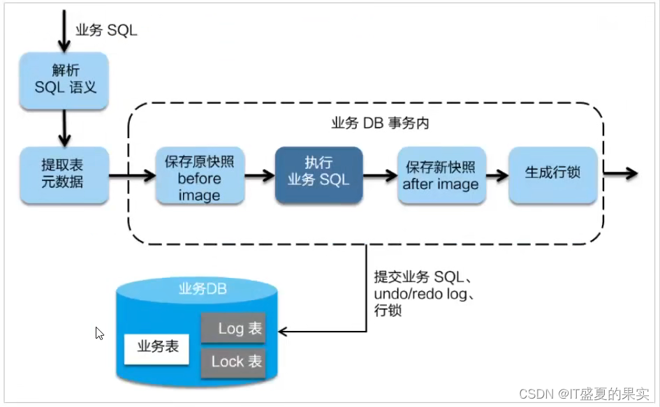 在第一阶段。Seata回拦截业务sql,首先解析sql语义,找到业务sql要更新的业务数据,在业务sql更新前,将其保存为"before image",然后执行业务sql,更新业务数据之后,再将其保存为"aftr image",最后获取全局行锁,提交事务。以上操作全部在一个数据库事务内完成,这样保证了一阶段操作的原子性。
